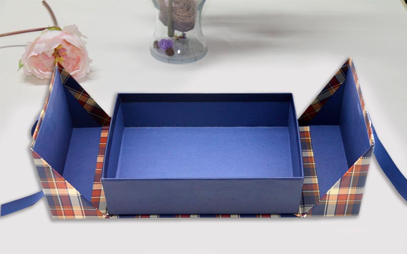 1.材質:盒子採用157G銅版紙,單面彩色印刷,單面啞膜,裱1500G雙灰闆盒子内襯貼專藍色面紙,盒型爲雙開翻蓋盒,盒子正面粘2根藍色絲帶,此款包裝盒純手工制作
