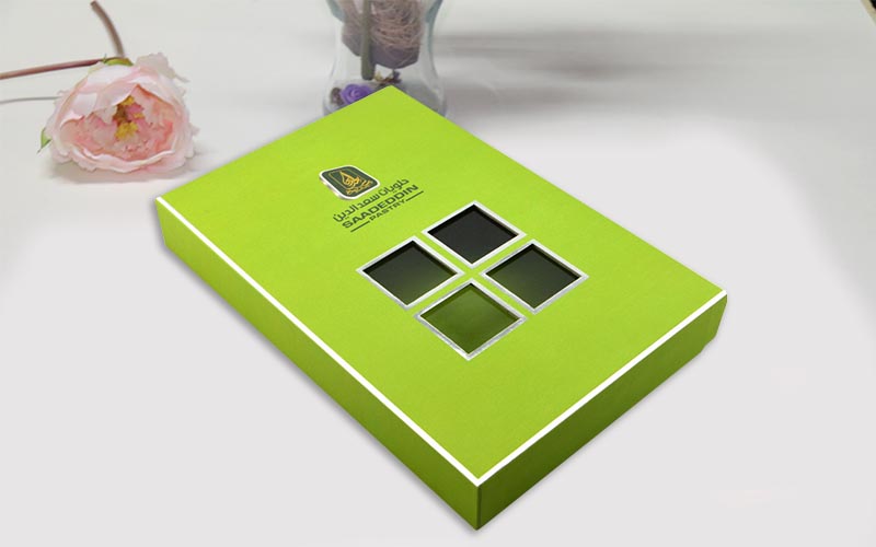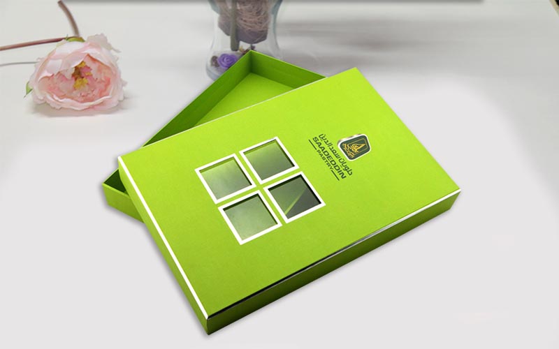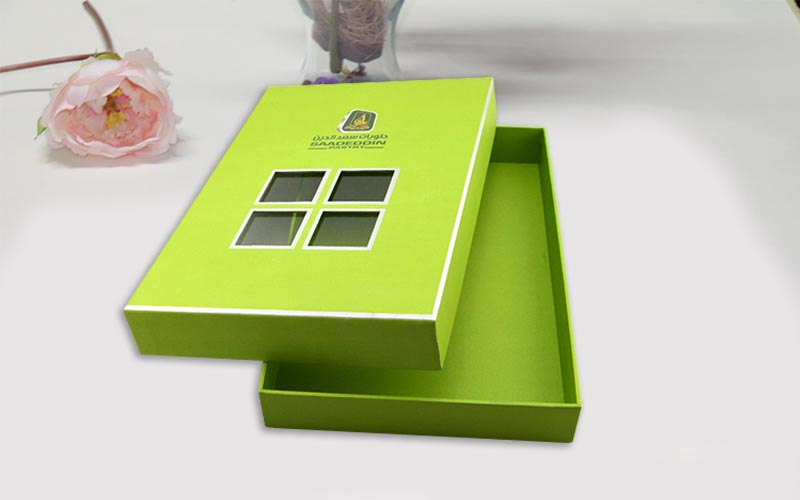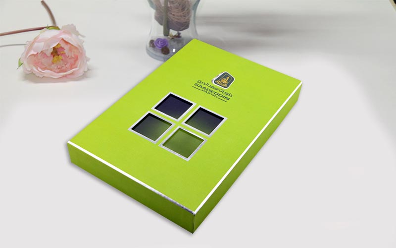 1.材質:盒子面紙用銀卡紙四色印刷,盒子底部打白墨,單面啞膜裱1500G雙灰闆,盒子内部裱一層染色紙,盒型爲天地盒上盒蓋開窗可以隐約看到裏面的産品 ,更有一種神秘感,流水線制作。