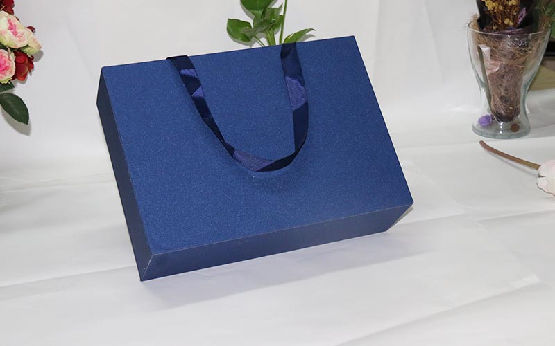 1.材質:盒子面紙用藍色磨砂特種紙,内盒也在用金黃色特種紙,裱1500G雙灰闆成品粘兩條絲帶方便客戶攜帶貨物,切記貨物太重的不能這樣。不然到時候繩子斷開産品就會受損,盒子比較大整款盒子都是手工制作。