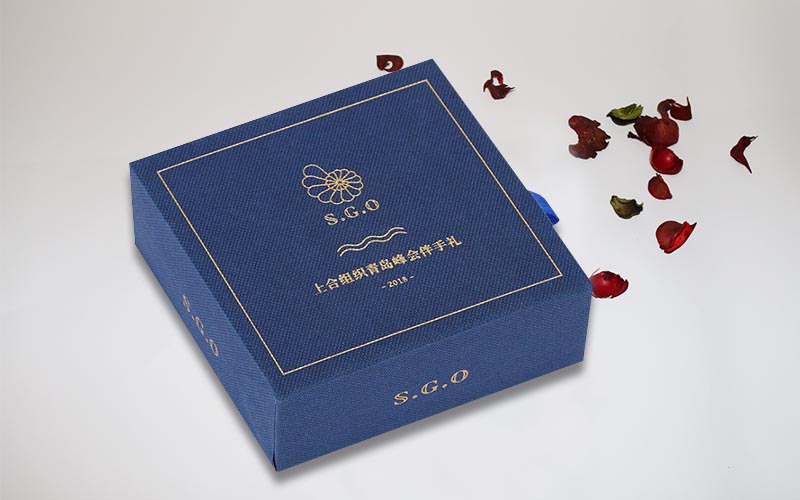 1.材質 :盒子面紙採用小石頭紋的藍色特種紙,盒子表面文字LOGO燙金色,裱1200G單白闆,整體盒子爲抽屜盒性,抽拉的地方裝藍色的絲帶。整款盒子手工制作。