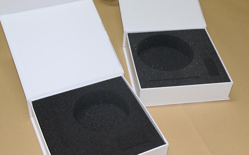 1.材質:盒子外殼用157G銅版紙單面彩色印刷,裱1500G雙灰闆 ,盒子表面不需要特殊工藝,盒型爲翻蓋盒,内托用44密度的黑色海綿。整款盒子簡單好做,都是上機器制作。