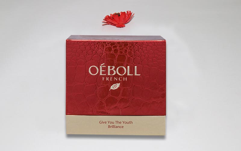1.材質:單隻裝美白霜包裝盒,盒子面紙採用金卡紙,專紅色印刷,整個盒子都要做鳄魚紋路的壓紋工藝,單面覆光膜,裱1200G雙灰闆,盒子底部内托用白色EVA包金卡紙固定産品。盒子上下天地盒,手工制作成品。