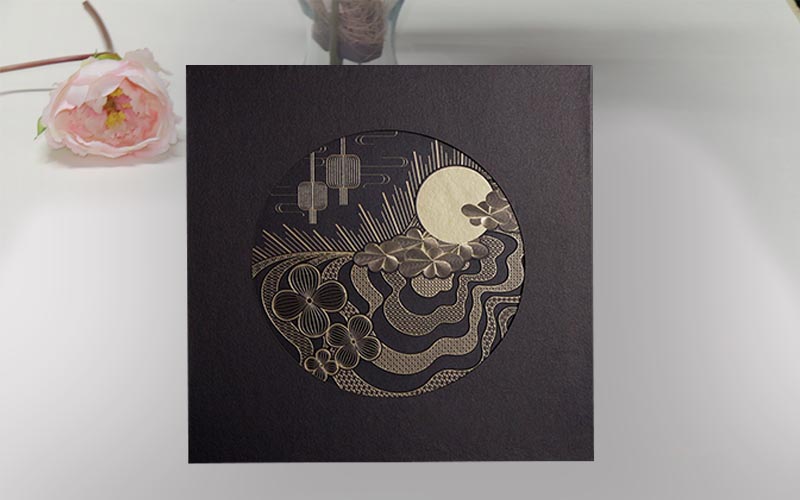 1.材質:.盒子面紙黑色珠光紙表面燙金文字 ,中間镂空圓形貼黑色特種紙燙金裱1300G灰闆镂空花型,盒子整體裱1500G雙灰闆盒型爲天地盒+内圍條。手工制作手提袋中國紅珠光紙簡單的燙金工藝。